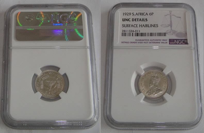 Union of South Africa: Sixpence (6d) of 1929 : NGC graded UNC details