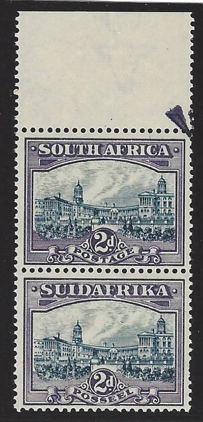The Union Handbook ("UHB") ascribes a value of 400 to the 2d Roto Blue and Violet Arrow block UHB 38A Cg. By comparison the UHB ascribes a value of 500 to the Roto 1/2 d Tete-beche pair (SACC 42d or UHB B8 V1) - i.e. the value of the full 2d Roto Blue and violet is valued at 80% of the Tete-beche pair.