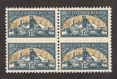 As per scans.Union SA 1 1/2d SMALL MINES Block 4 "BALLOON & DAMAGED BUILDING.DOT RIGHT OF HEADGEAR!"-Mint Never Hinged.See scans.Sold as is