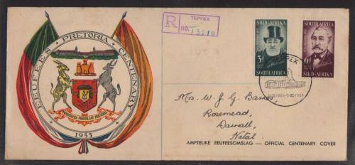 UNION SA 1955 CENTENARY PRETORIA SET OF 2 ON REG COM COVER WITH TEPPEX 31/10-5/11/55 D/S