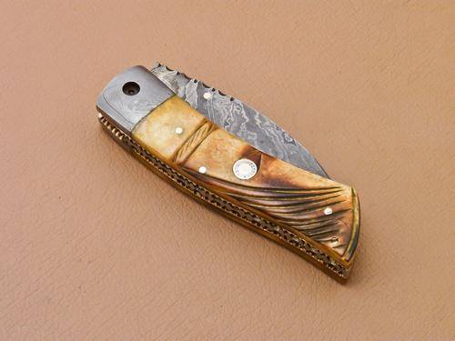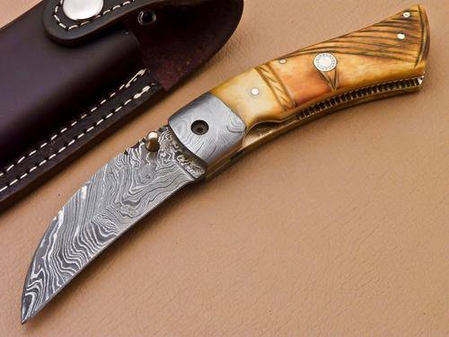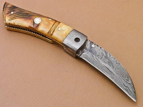 UNIQUE CUSTOM DAMASCUS POCKET KNIFE WITH HAND CARVED CAMEL BONE