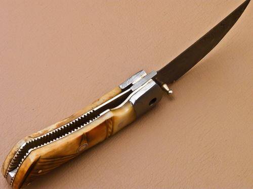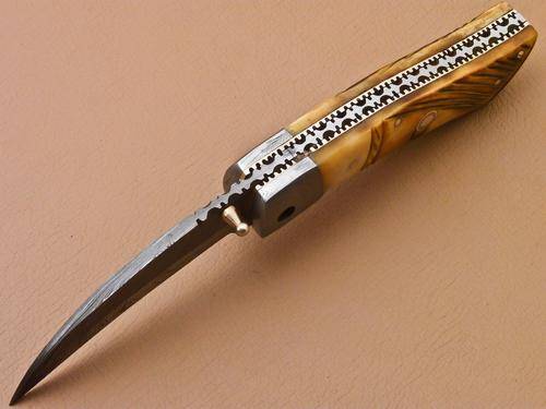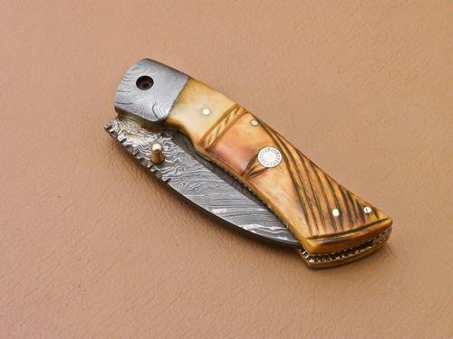 3 mm Thick blade going all the way inside the handle without any joint and weld. Maker hand forged the blade of this knife with 1095 and 15N20. Blade was given excellent heat treatment and Rockwell hardness of the blade along its edge is 57 and along the spine is 42-45. 3 mm thick blade has fantastic hand grinds on both sides. Overall length is 7.0"(Opened) and length of the handle of this unique knife is 4.0" (Closed) and the length of the blade is 3.0". Handle is Hand Carved With Camel Bone AND Damascus bolster