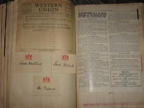 THIS IS AN ALBUM FULL OF FILM EPHEMERA, WITH PICTURES, RADIOGRAMS, CABLES, DINNER INVITES, SIGNATURES, TICKETS, LETTERS AND MANY MORE, PLUS A PERSONAL PHOTO ALBUM OF HARRY CURRY. THESE PHOTO'S BELOW ARE ONLY A FEW OF WHAT'S IN THE ALBUM