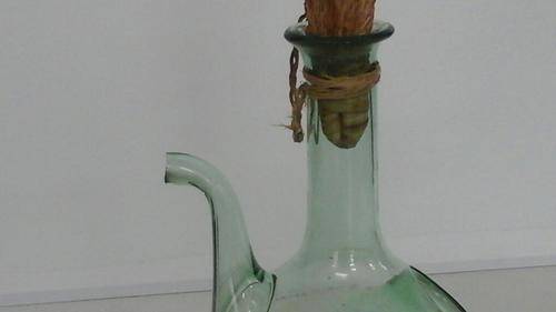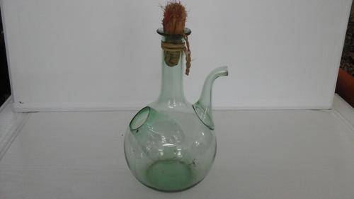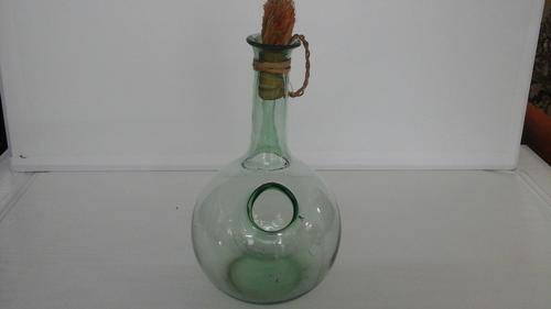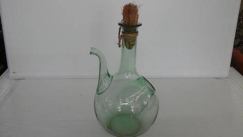 UNIQUE INTERESTING GREEN GLASS KETTLE. CORK AND GRASS LID. STANDS APPROXIMATELY 250MM HIGH