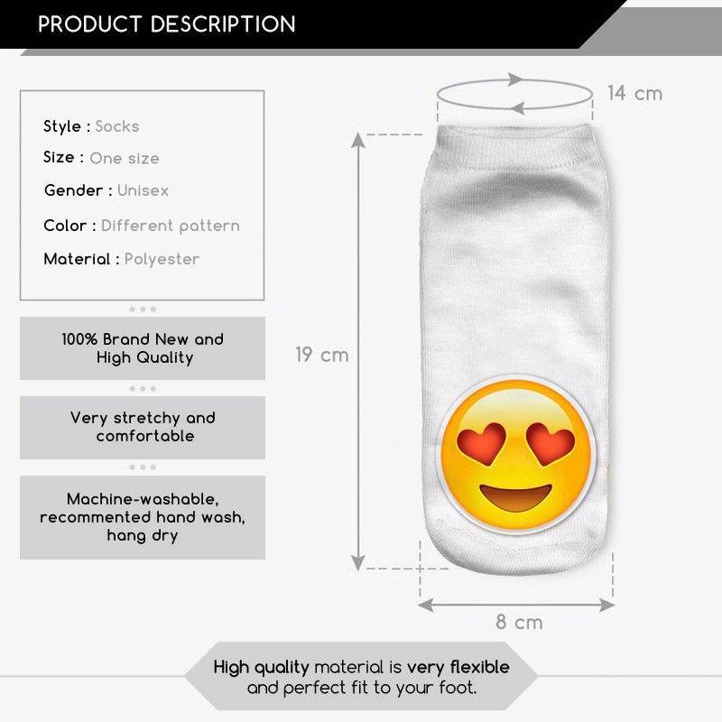 Package weight: 0.02 kg Features: 1.Lovely appearance and beautiful patterns design will make you attractive 2.Breathable,Comfortable, keep warm and Vogue Beauty. 3.Stylish and practical, durable and comfortable for your daily use. 4.They will keep your feet warm in this snowy night. Description Material:Polyester Color: 10 Patterns for Choice Function of underwear: at home,sport Pattern:Emoji,3D Printed Apply to season: Spring,Autumn,winter,Summer Socks functional purposes: Breathable, Deodorization, Antibacterial,Warm Weight:21g Detail In Size:Flat Size: 19cm*8cm(Length*Width) (1cm=0.39Inches) Package Include:1 pairs of Socks More Detail: #03 #04 #05 #06 #07 #08 #09 #10