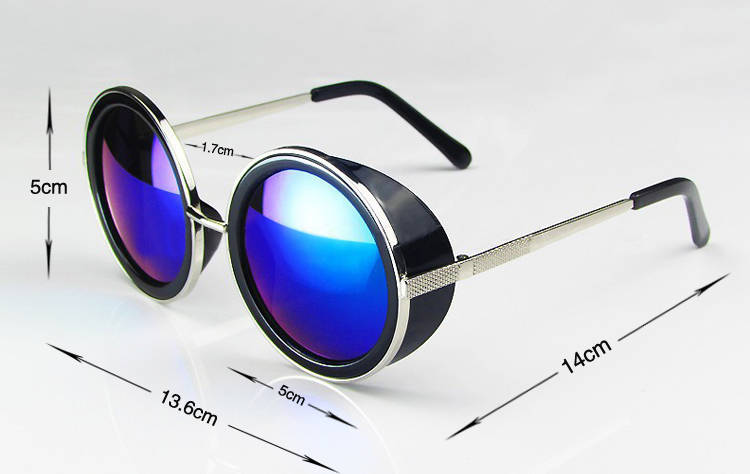 Package weight: 0.05 kg Features: 1.Super big round mirrored lens will make you attractive. 2.Designed For: Men/Women. 3.Steampunk vintage design, makes you unique. 4.Protecting your eyes in the glare. 5.Portable for you to carry, enjoy the time. 6.As a perfect gift for yourself or your friends. Description: Lens Material: Resin Frame Material:Metal&Plastic Colors:Silver-Black,Blue,Golden,Leopard,Golden-Black UV Protection:16%~20% Light Transmittance :99.9% Style:Unisex,Vintage,Steampunk Features:Round Mirrored Lens Weight:45g Deatail In Size:Frame length:13.6CM Frame height:5CM Lens length :5CM Bridge of the nose width:1.7CM The glasses legs:14CM Package includes:1 x Sunglasses More Deatil: #1 #2 #4 #5 #3 Disclaimer : About Size:Size may be 2cm/1 inch inaccuracy due to hand measure.These measurements are meant as a guide to help you select the correct size. Please take your own measurements and choose your size accordingly.we cannot accept responsibility for incorrect purchases.