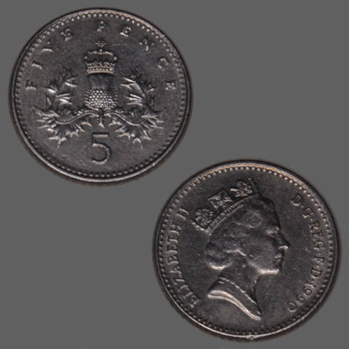 United Kingdom 5 pence 1990 Coin - Obverse ELIZABETH II D G REG F D / RDM - Reverse 5 / FIVE PENCE - Copper-Nickel