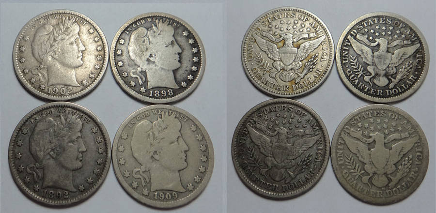 You are bidding here on 4 silver Barber-Head Quarter Dollars dated 1892, 1898, 1902 & 1909 (D).