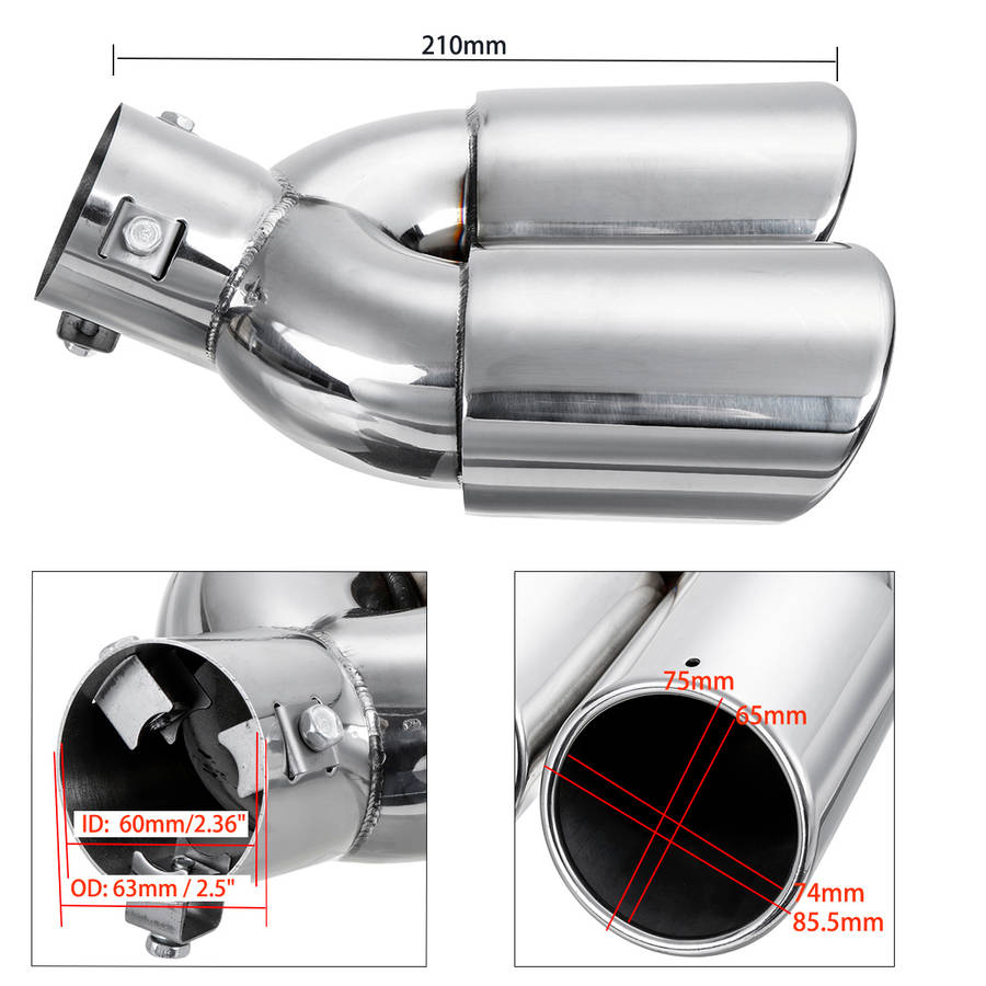 Specification: Model: E72208 Product Name: Exhaust Tips Color: Chrome Material: Stainless Steel Surface Finish: Glossy Design: Round Inlet: ID: 60mm/2.36 OD: 63mm / 2.5 Installation dimension: 38-60mm Total length: 210mm Fitment Type: Performance/Custom Fitness: Suitable for 60mm diameter exhaust pipe. Qty: 1pc