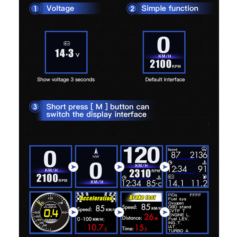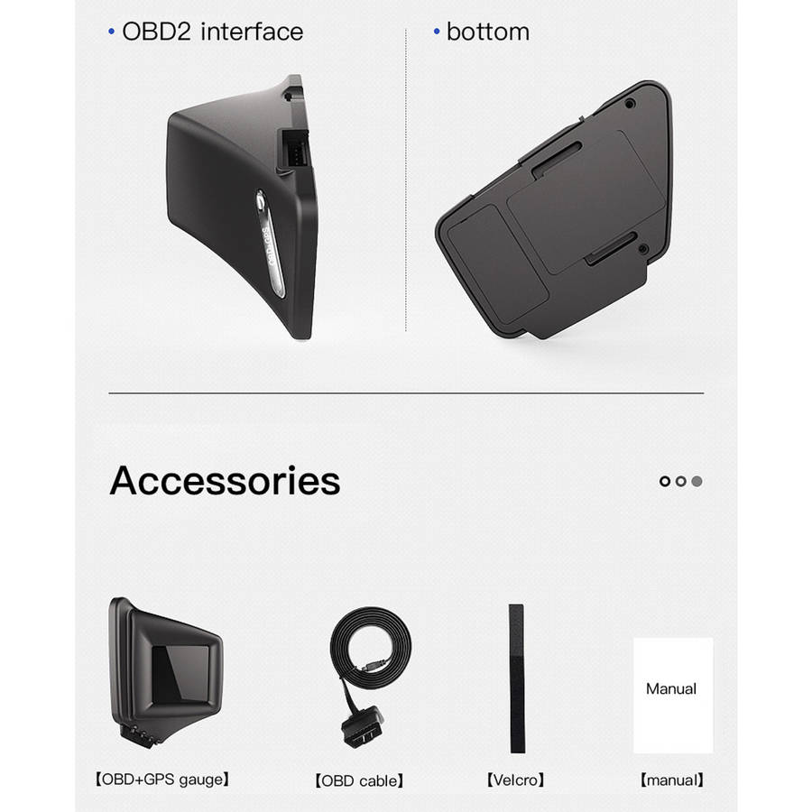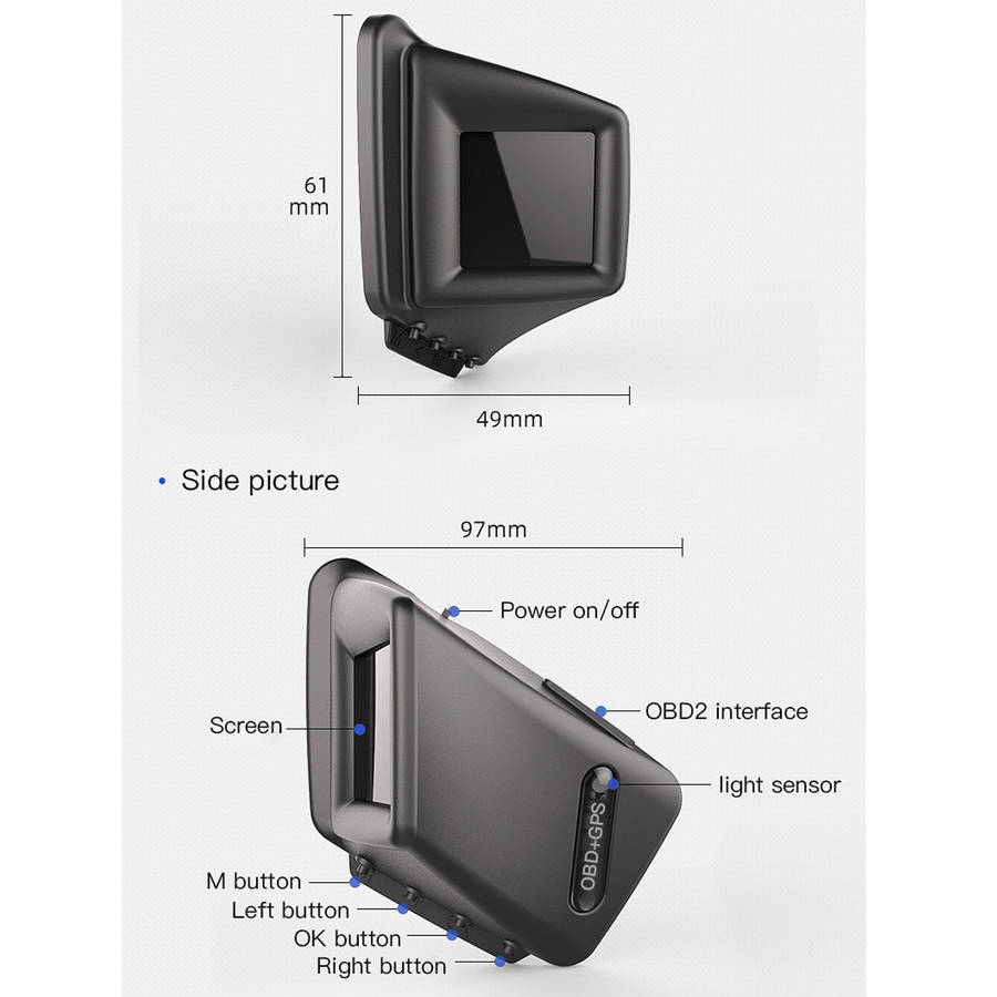 Features: -Clear fault code. -Warnings related to exceeding the programmable speeds or RPM. -Dual mode, OBD data + GPS data can be displayed at the same time, GPS data is applicable to all models. -Various installation methods, flexible and convenient. It is installed in front of A-pillar and placed in front of center console. -Display vehicle data such as speed, engine RPM, battery voltage, fuel consumption, coolant temperature, turbo, oil temperature etc.