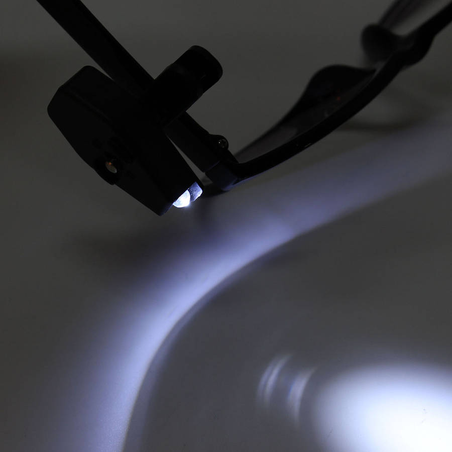 Description: Item Type: LED Glasses Clip Light Material: Plastic Light Source: LED Battery Type: 2*CR2032 Color: Black