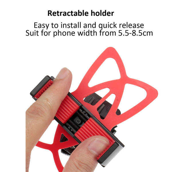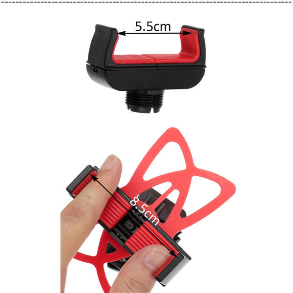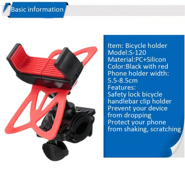 Material:PC+ Silicone Color:Black with Red Phone holder width: 5.5-8.5cm Fit for bicycle/motorcycle handlebar 15-30mm Compatible for most mobile phones, MP4/MP5, GPS, PDA and so on