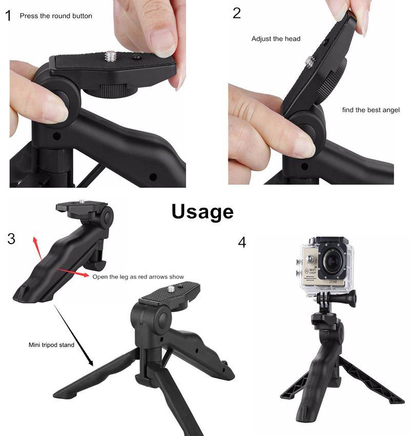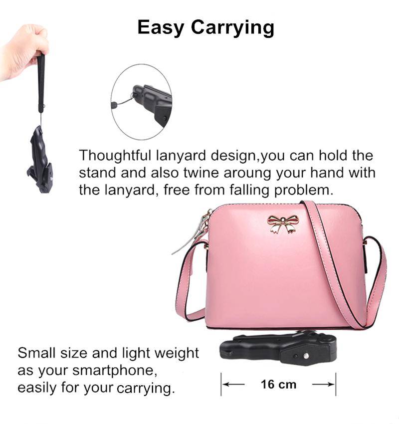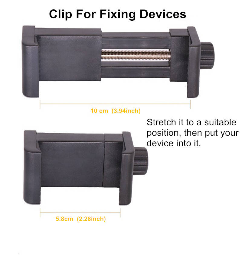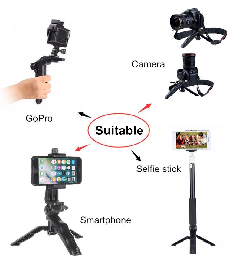 1. Practical 2 in 1 new design, handle stabilizer and desktop tripod, you can have it record videos stably as stabilizer, besides, you may be allowed to broadcast youself or take photos for youself without any other favors; 2. Eco-friendly plastic material, light weight and small size, you can carry it anywhere during your travel, record your life clearly; 3.Thoughtful lanyard design, easily carring and prevent it from falling from your hand; 4. Available for almost all smartphones, cameras, GoPro and selfie stick, sports camera up to 0.80 kg, always standby for you; 5. 75° head rotation, adjustable connection platform, choose the best angel for you; 6. Usage: open the two legs and it will turn into a tripod stand, then press two round button and adjust the best platform angel for you, match your device with clip to the holder;