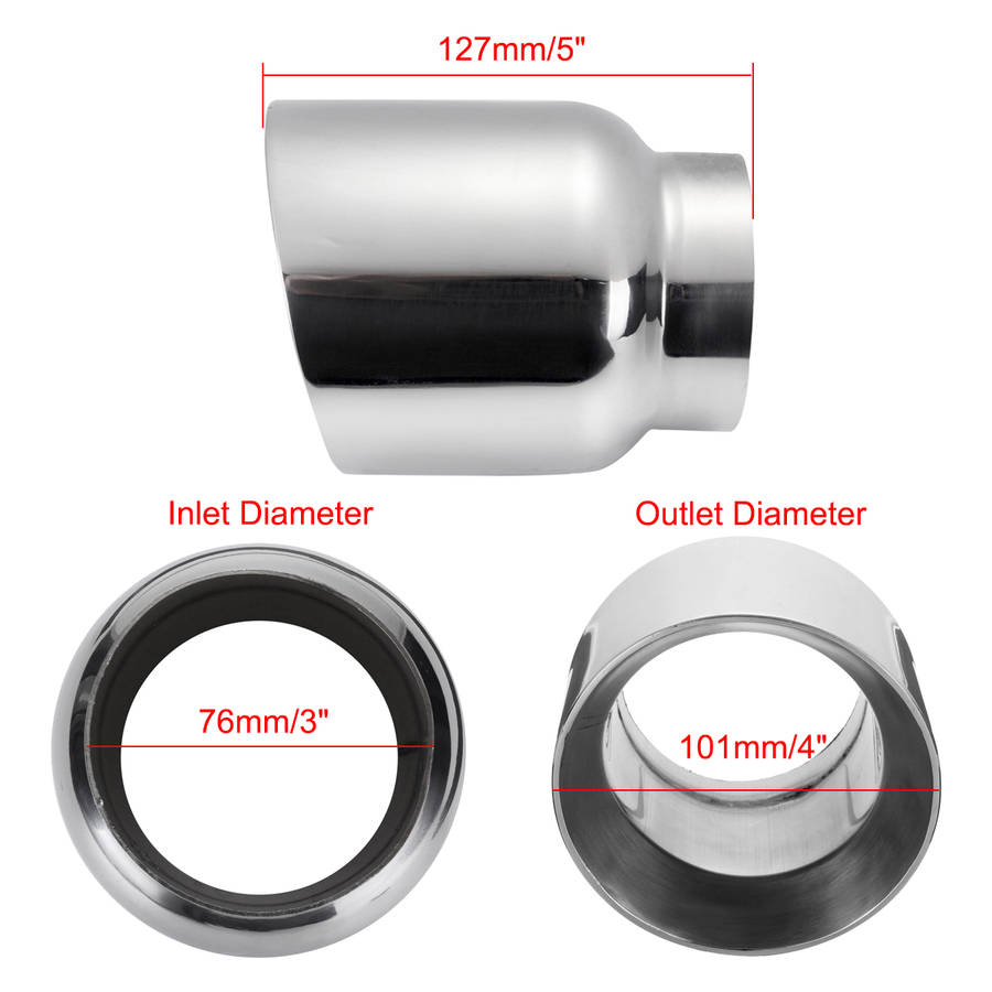 Specification: Condition: 100% Brand new Model number: 919673 Material: Stainless steel Color: Chrome Length: 127mm/5 Inlet: 76mm/3 Outlet: 101mm/4 Installation method: Weld On Tip style: Double wall slant Surface finished: Polished