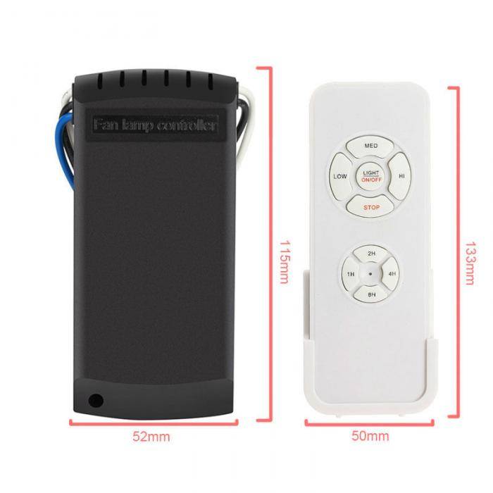 Package weight: 0.19 kg Specification: Operating Voltage:AC220-240V Working frequency:50-60Hz Loading power: ceiling fan: max.1000W Current:2A Remote control distance:60m Working temperature:-20~40¬トテ Material:plastic Size: Remote control:133*50mm Receiver:115*52mm Feature: Compatible with most ceiling fan & lamp Set switch lights, wind speed adjustment, timing, one key to complete. Coming with remote control stand Accurate, reservation function, ignore the obstacles. Package included: 1*remote control(battery not included) 1*receiver 1*holder
