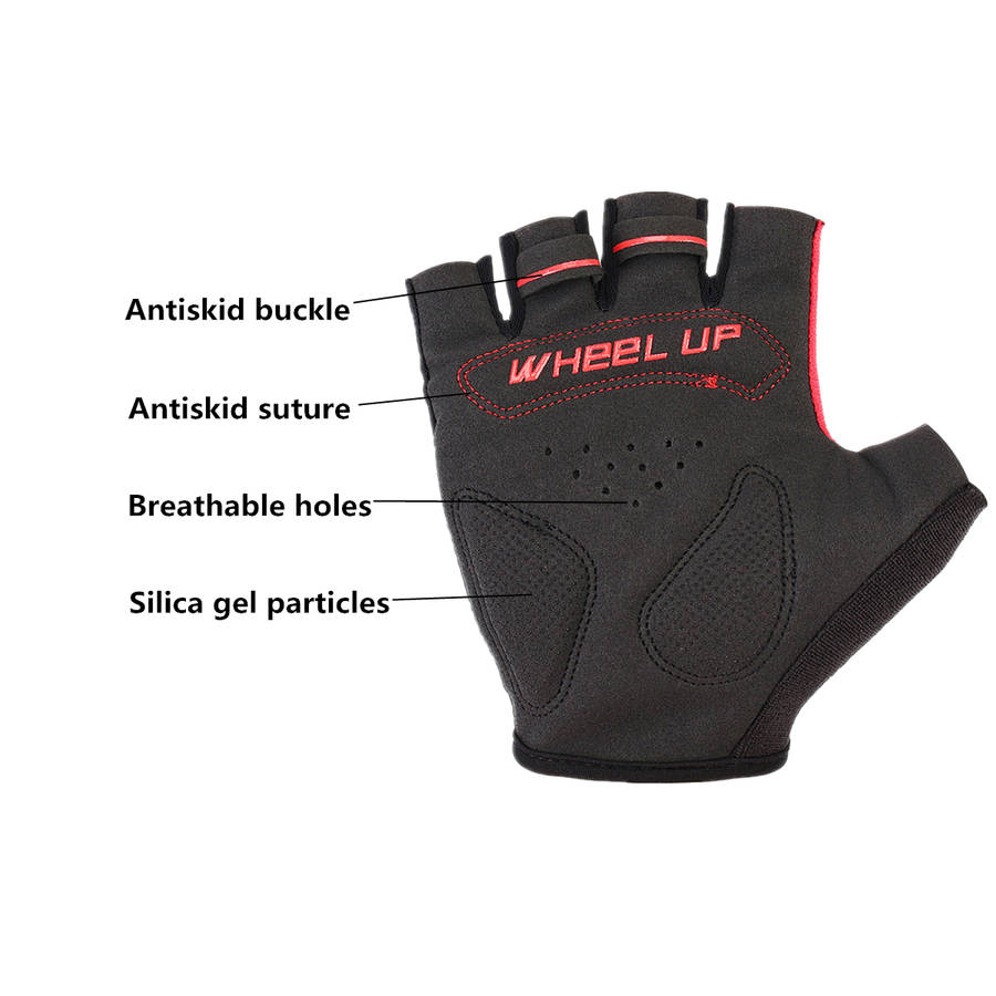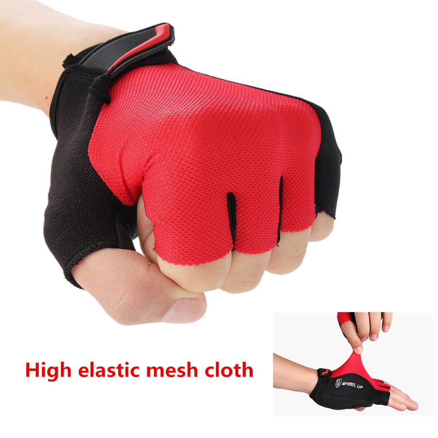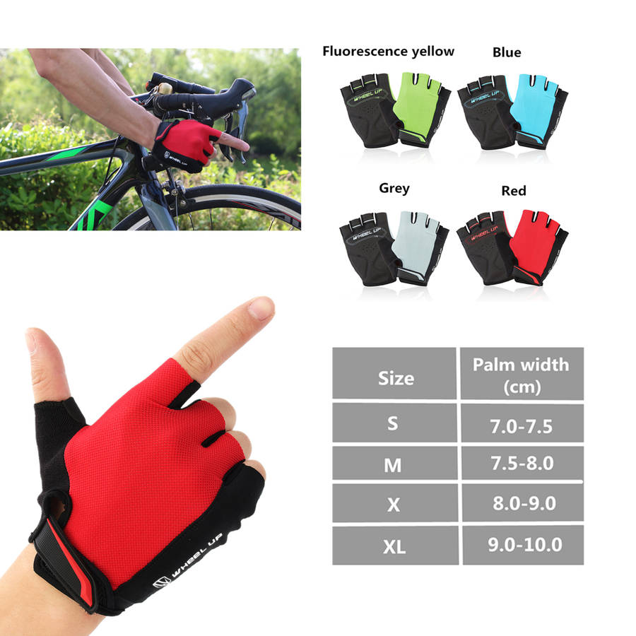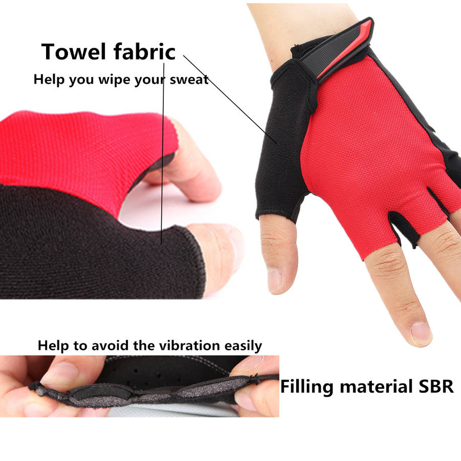 Specification: Item: Half finger gloves Size: M Color: Red,blue, gray, fluorescence yellow Applicable gender: Male and female,universal Applicable season: Four seasons (spring, summer, autumn and winter) Padding: Sponge, SBR Main material: Nylon Function: Anti - slip, anti - perspiration, ventilation,protect