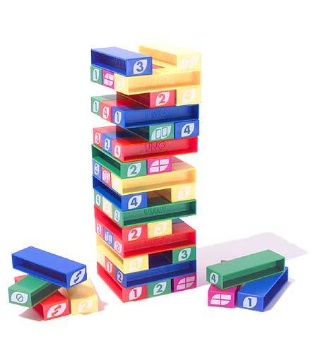 Red 1 / Blue 2 / Green 3 / Yellow 4 / Reverse / Draw Two, Players roll the Uno Cube to determine the moves they each make. When a colored number turns up, the player pulls a block having the same color or number as the side indicated. For instance, if a player rolls Yellow 4, the player must pull a block which is either yellow or bears the number 4. When “Reverse” turns up, the direction of play is reversed. “Draw Two” forces the player to pull any two blocks and place them on the top of the tower.
