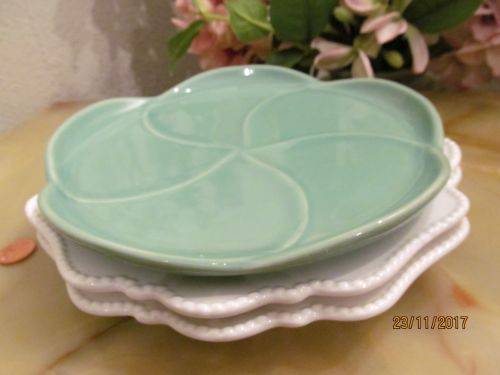 2)- A PICKLE GREEN CIRCULAR PLATE WITH A SCALLOPED RIM AND RAISED WAVE MOTIF UPON THE SURFACE TO GIVE THE PLATE THE APPEARANCE OF A WATER LILY. THE ITEM IS STAMPED UNDERNEATH - "WOOLWORTHS, STONEWARE, DISHWASHER MICROWAVE AND FREEZER SAFE" 2.2cm HEIGHT.....20cm DIAMETER