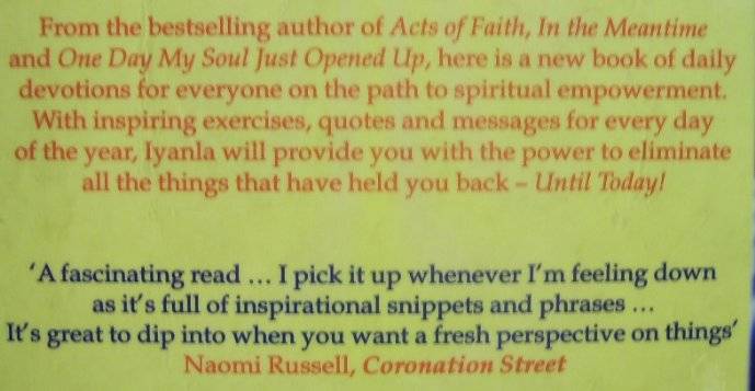 Bestselling author Iyanla Vanzant has had an amazing and difficult life - one of great challenges that unmasked her wonderful gifts and led to wisdom gained. Now, in the inspiring tradition of ACTS OF FAITH - a publishing phenomenon with almost 1 million copies in print - UNTIL TODAY! provides a year's worth of daily inspirational quotes, explanations from Iyanla, and brief exercises or actions for readers to perform. UNTIL TODAY! provides a meaningful but bite-sized foray into a deeper, more satisfying spiritual and emotional life.
