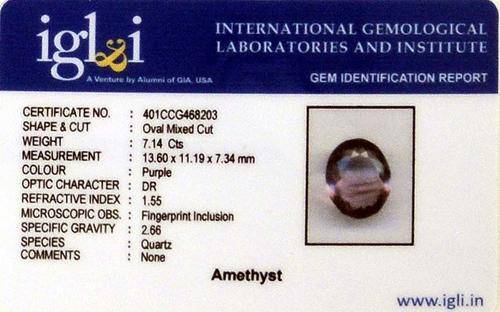 Untreated Oval Cut 7.14 Ct IGLI Certified Amethyst Gemstone - Brazil Mines