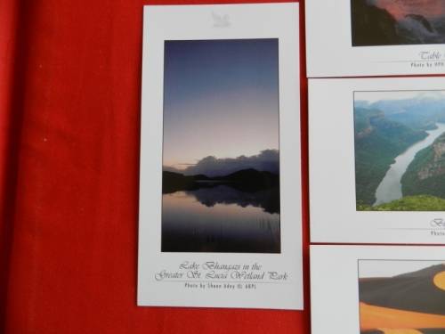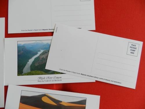Unused long Postcards – Readers Digest – Majestic SA, land of beauty and splendour collection - Set of 5. Table Mountain at Dusk, Kalahari Gemsbok National Park, Blyde River Canyon, St Lucia Wetland Park and The Namib. Authentic colour photographic Postcards.