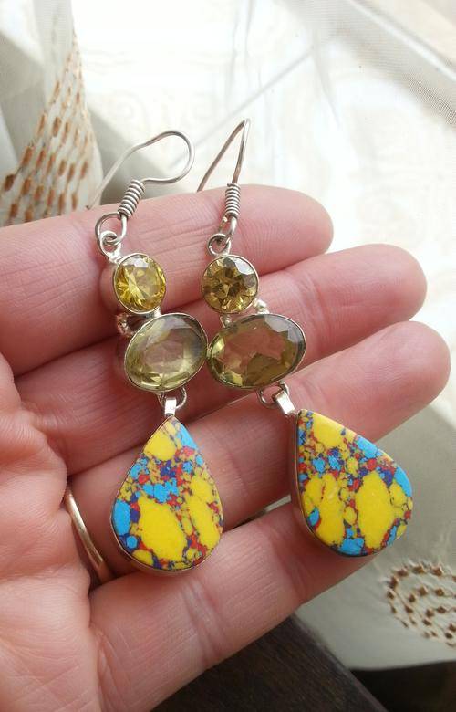 Beautiful and fun clearly marked 925 silver earrings with semiprecious stones - citrine/ lemon quartz/ jasper - very impressive!
