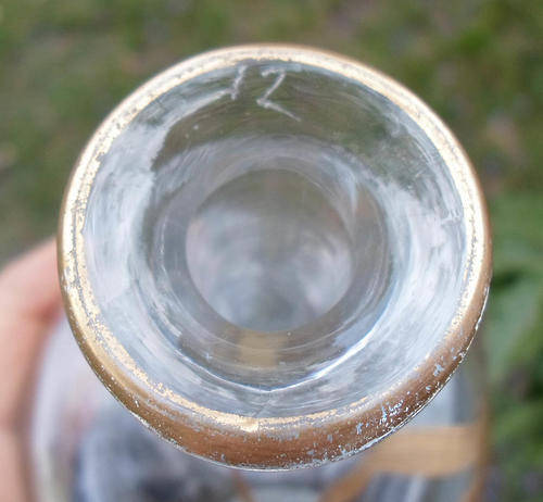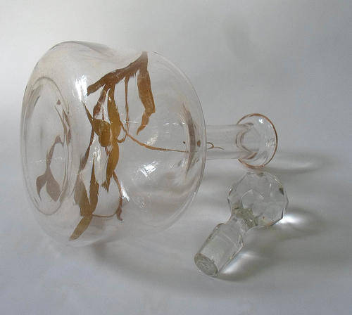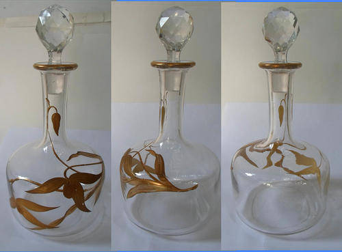 Large Antique perfume or cologne Bottle with crystal facet cut stopper. Applied gilt leafy foliage in the Art nouveau style. Gilt shows slight wear commensurate with the age, but there are no cracks, chips or bruise marks and no glass disease. Stopper also VGC. Bottle measures approximately 18 cm high and about 7.5 cm widest. No makers marks seen. Post Tuesday/Wednesday, double boxed for added safety.
