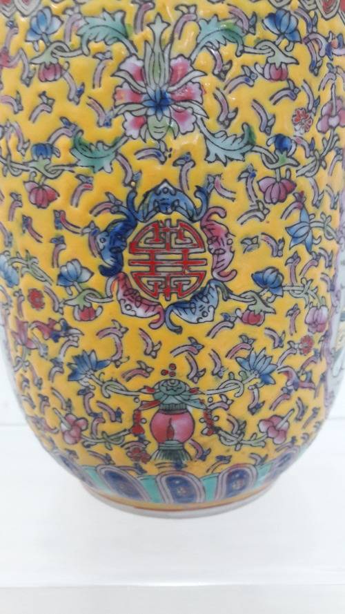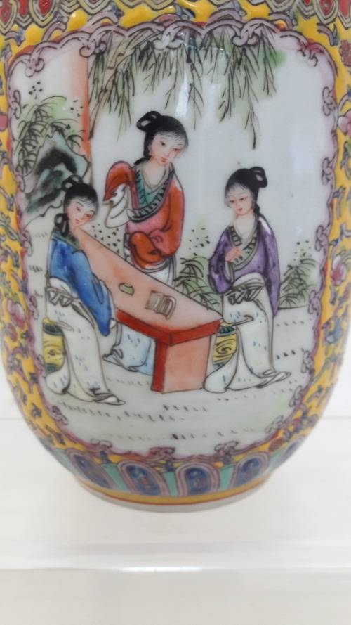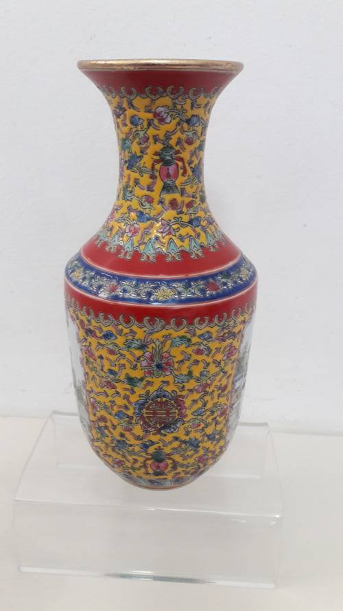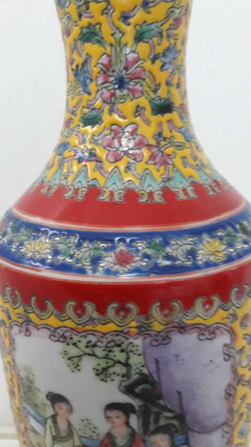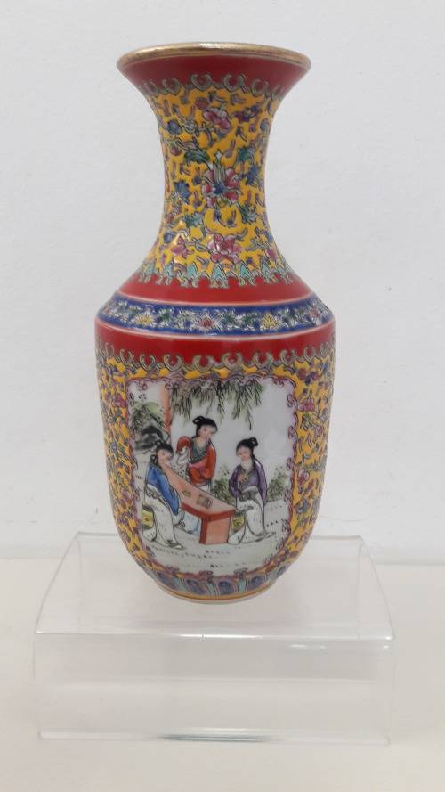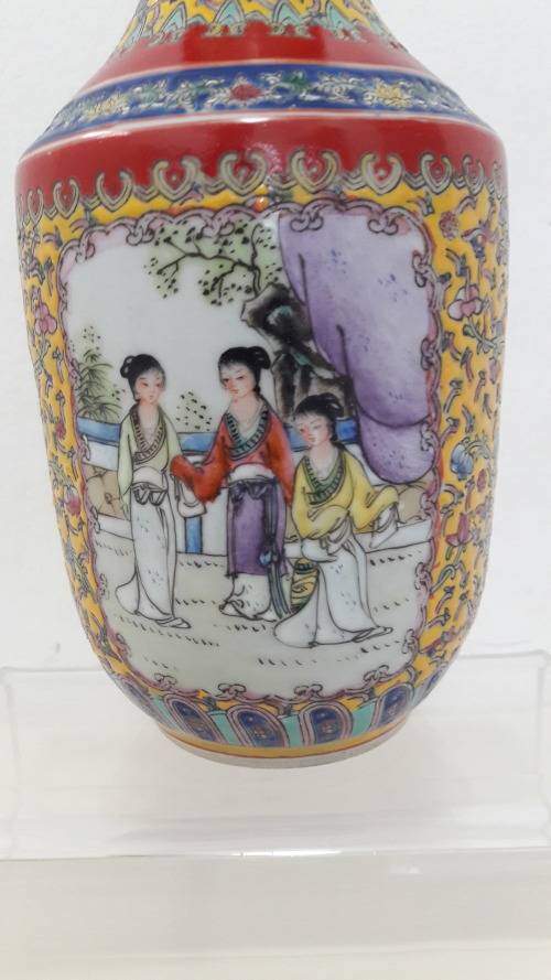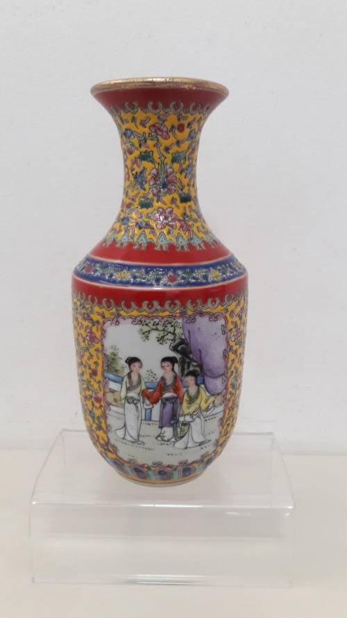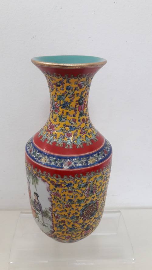 Offered for sale is a fine and unusual yellow ground Chinese porcelain vase decorated in the famille rose style ; the vase has a classical bottle shape with a tapering cylindrical body, and tall neck with a slightly flared convex rim. The vase is hand painted in bright onglaze polychrome enamels with the body of the vase in a vibrant daffodil or canary yellow with contrasting dark red and cobalt blue borders at the midpoint /shoulder of the vase and the upper rim of the neck . The interior of the vase is celadon green with a gilt upper rim. The body of the vase is decorated with two fan shaped cartouches with delicate hand painting of three courtesans in traditional attire in a garden setting. The exterior of the vase is richly patterned with interlocking abstract patterns or curlicues together with a repeated motif of flowers and blossoms , foliage and tradional round abstract symbols of longevity . The base of the vase has a blue underglaze Qing dynasty Qianlong mark which is likely a tribute mark/honorific mark reading Da Qing Qianlong Nianzhi. Most likely this vase was made in the early 20th Century. Size is : height 23cm ; width across the middle of the vase 10cm ; top round aperture 7.5cm ; base 6.5cm . Postage is R100 via Postnet or R140 for courier delivery to major cities in SA. Collection is welcome from Emmerantia Jhb.