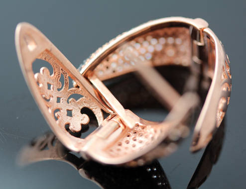 These earrings are most unusual, both in design and colour! The shape is a long triangle with rounded points and gently curved; the earrings are hinged in the middle, with a shaft that fits neatly through a hole in the back triangle, creating a particularly secure closure. A leopard skin design created purely by a pavé setting of a multitude of cubic zirconias, all claw set, in white, champagne and black, form the face of the earring. When designing the earrings, the jeweller has considered the rear view of the earrings, and reverse of the earring is an openwork, almost Celtic design that provides interest as well as keeping the weight down. The earrings are hallmarked '925' for sterling silver. Interestingly, the jeweller has finished the sterling silver structure with a bonded rose gold hue. I am not normally attracted to jewellery that is all cubic zirconia, but these are so unusual and they have good glitter without being bling or cheap looking. Very African, very modern and pretty amazing on!
