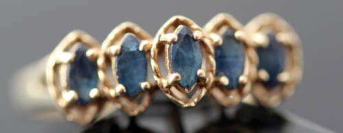 This lovely piece features 5 faceted marquise-cut blue sapphires raised on long claws, terraced in height on either side from the middle, with the ring head reaching down the shoulders. The ring has a slim 10ct yellow gold shank that supports the ring head with its 5 gemstones on an unusual openwork structure that includes a twisted rope marquise-shaped border in gold that frames each sapphire. The colour combination of warm yellow gold with the contrasting unusual bright blue of the sapphires is classic and elegant. The blue hue is almost cornflower in appearance although it has an interesting steely undertone. The ring is in good condition and the '10K' hallmark indicating 10ct gold and the jeweller's signature appears on the inside of the shank. There is no assay hallmark but I bought it from a vintage jewellery in Birmingham. I have had the ring jeweller tested and authenticated. Unusual decorative detailing makes this piece stand out - it is really beautiful on the hand, a particularly nice collectable piece of gemstone jewellery!