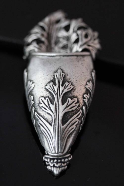 Made by American pewter jewellers, the Metzke family, this rather special little collectable is a throw-back to a bygone era. A "tussie mussie" is a Victorian-style bouquet brooch, allowing the wearer to pop a small posy of flowers into a vase-like container and wear the whole thing as a wonderful jewellery alternative to a boutonnier, or button-hole. In the Victorian era often referred to as a nosegay. This collectable item is reallly solid, weighing 23,13 grams and measuring a substantial 75 mm x 30 mm. It is made out of pewter and has a sheen rather than a high shine finish. The exterior has been worked with a raised tactile leaf design detail and the top of the brooch segment is finishe with a flouris of leaves coming out of the "vase". It is double - 3D if you like - in order ot accommodate the flower posy of your choice. Please note - you can't put water into this tussie mussie. You simply pop the flowers in and wear it for the day or occasion. However, you can wrap the stems of your flowers in wet cottonwood or tissue to prolong their life and the vibrancy of your unusual brooch! The piece has the hallmarks "Metzke" and the year "1980", no doubt its year of making. Pewter does have a buffed texture but generallly the condition is excellent. Not seen many of these around - rather a fascinating conversation piece and collectable!
