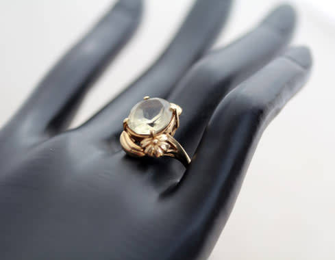 Delicate and ornamented, yet surprisingly heavy at just under 4 grams, this beautiful Birmingham assay vintage ring features a large oval faceted citrine solitaire claw set in 9ct yellow gold. A slender 9ct yellow gold shank splits into 3 on both shoulders and twists, curving to the left in an openwork design that supports the ring head with one prong, provides a base for a pretty flower design on the second, and a long curved leaf cupping the gemstone on the third. The floral decoration is a classic design favoured by English jewellers. The ring head - 14mm in width x 17mm long, has elongated claws that hold the head a splendid 8mm above the finger. The pedigree of the piece is evident in the hallmarks; the jeweller's signature, the Birmingham Assay mark, and the 375 hallmark for 9ct yellow gold. The ring has been authenticated by an independent jeweller and is in good condition, but has some buff marks. Beautifully made with an unusual design, the golden yellow of the citrine next to the warm yellow gold makes for a striking piece of jewellery!