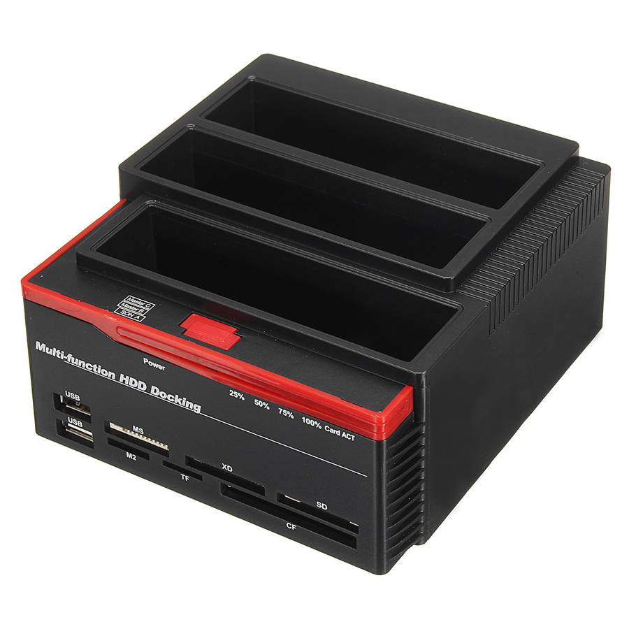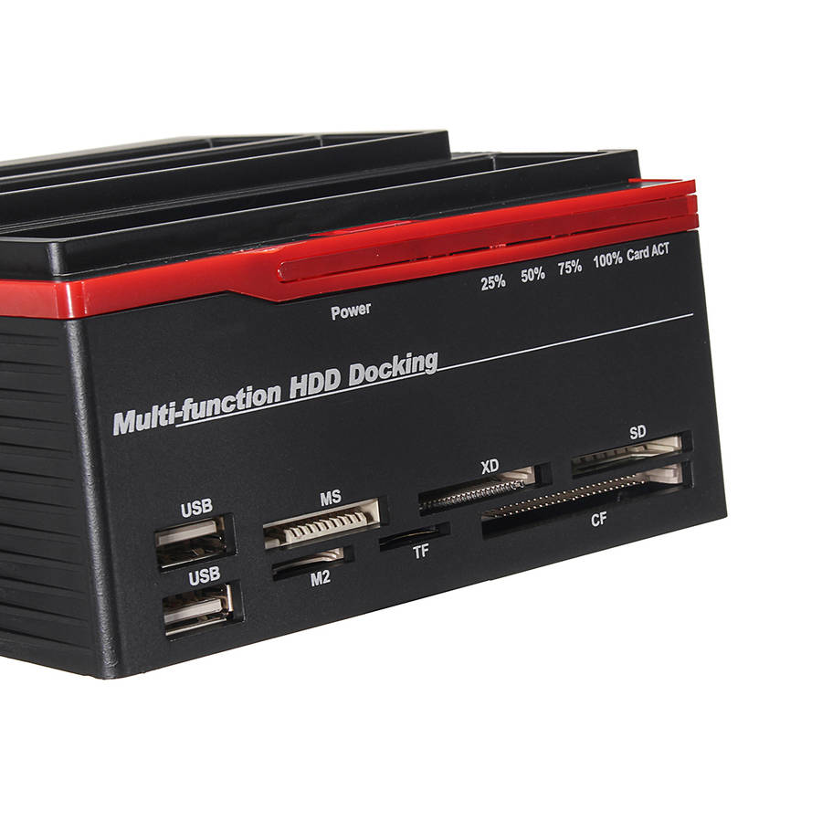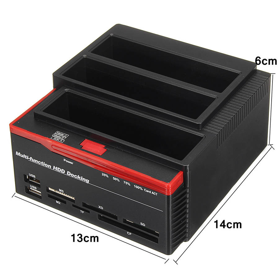 1. Product Name: External Triple SATA IDE HDD Docking Station 2. Material: Metal 3. Interface: SATA I 4. Output: 12V 3A 5. Power Input: 100-240V 50~60HZ 6. Interface: 2* USB 2.0/ 1*USB 3.0 / 1*MS/ 1*M2 / 1* XD/ 1*TF/ 1*SD/ 1*CF/ DC 12V port 7. Support: All 2.5" & 3.5" SATA HDD SSD 8. Size: 130 * 140 * 60mm / 5.12 * 5.52 * 2.36 inch 9. Standard Certification: CE, FCC 10. Plug specification: US plug(we will send a free plug adapter according to your country)