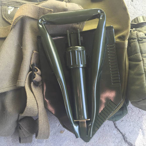 This is a basic belt webbing system with Y-Harness. Both the belt and harness are adjustable. It features 2x 5.56 magazine pouches, both can hold 3 magazines each. There is also a water canteen in a pouch, compass pouch and Butt Pack. It also has a new folding entrenching tool/shovel.