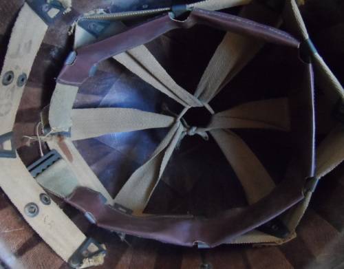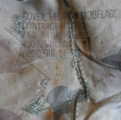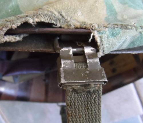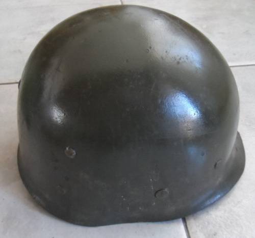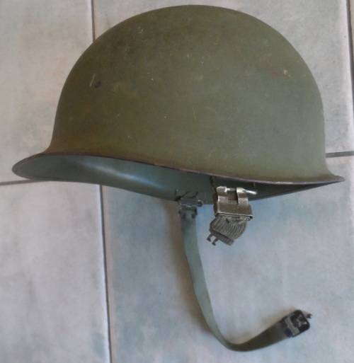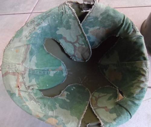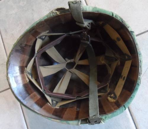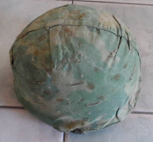 Post WW2 US Army M1 Helmet, with Vietnam era helmet cover. Metal helmet in good condition, some very slight surface rust on chin strap clip. Helmet inner also in good condition, no chin strap. Camo helmet cover in well used worn condition, faded with some repair jobs.