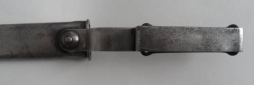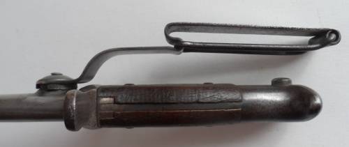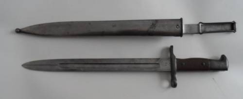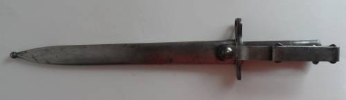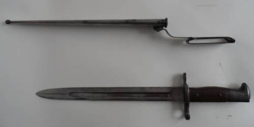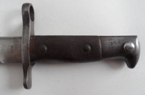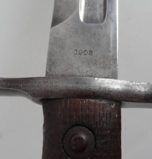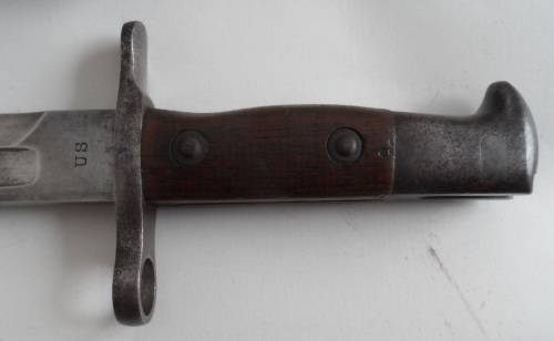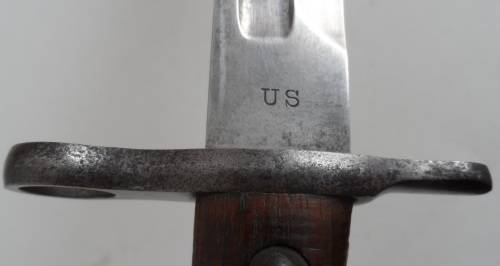 United States Army Pattern M1892 Knife Bayonet, for use on the .30 Government Caliber U.S. Magazine Rifle M1898. Ricasso marked one side: US, other side 1903. This model has the domed rivets and rough wood grips. Metal Scabbard, good condition. Blade length: 295mm, total length in scabbard: 447mm. Blade is in excellent condition, no rust, marks or staining. Bayonet overall condition very good. A rare find and in this great condition in SA.