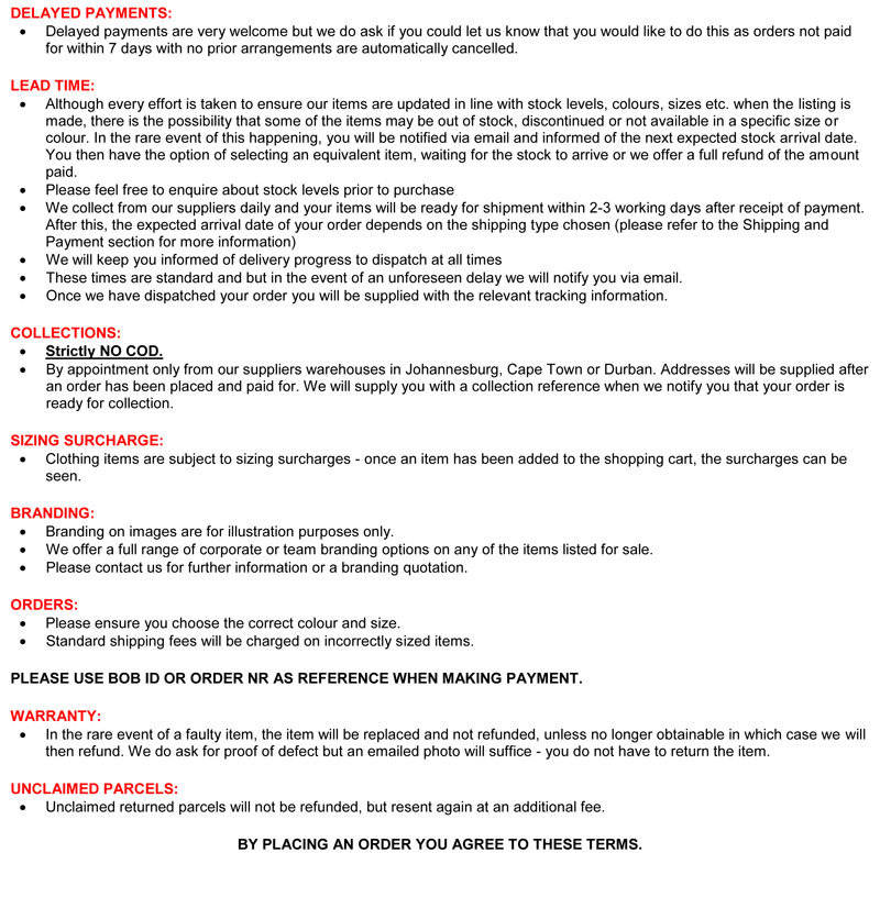 R65.00 Standard shipping applies to orders under R100.00, in most areas in South Africa. R35.00 Standard shipping applies to orders over R100.00. Some areas may attract a surcharge surcharge. This will be calculated at checkout if applicable.
