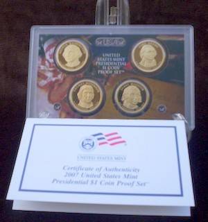 Also called 'Golden Dollars' the presidential one Dollar program started in 2007 and commemorates 4 Presidents every year, in the order that they served. This is the 2007 Proof Set that includes the first four presidents that served between 1789 to 1817. They are in order : George Washington, John Adams, Thomas Jefferson and James Madison.