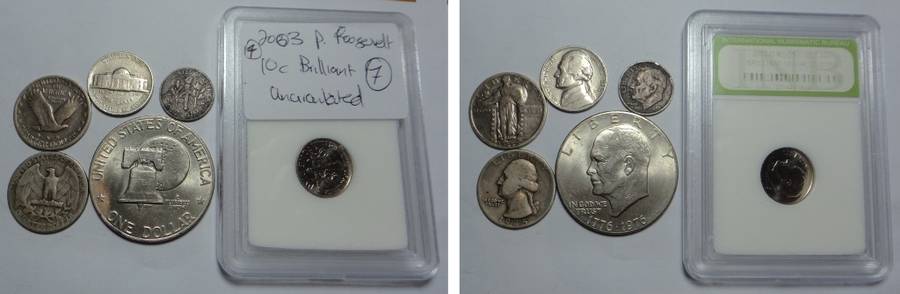 The coins are a silver Dime of 1953 (D), two silver Quarter Dollars of 1925 & 1945, a Nickel (5c) of 1961, an Eisenhower Dollar of 1976 and an INB certified Dime of 2003 (D) as brilliant uncirculated.