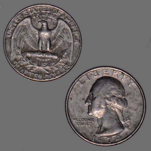 USA Quarter dollar 1974 Washington Quarter Coin - Obverse IN GOD WE TRUST / LIBERTY - Reverse E PLURIBUS UNUM / QUARTER DOLLAR / UNITED STATES OF AMERICA - Copper-Nickel plated Copper