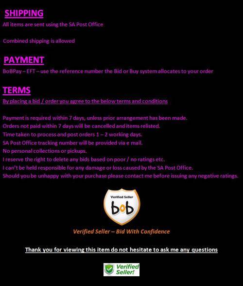 R65.00 Standard shipping applies to orders under R100.00, in most areas in South Africa. R35.00 Standard shipping applies to orders over R100.00. Some areas may attract a surcharge surcharge. This will be calculated at checkout if applicable.