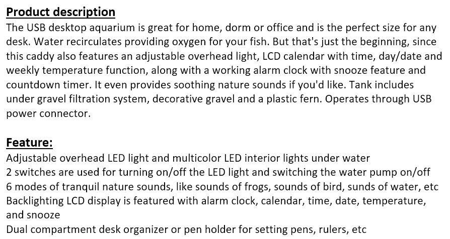 USB Desktop Aquarium, Water Recirculates to provide Oxygen, LED Light, LCD Display,Stationary Holder