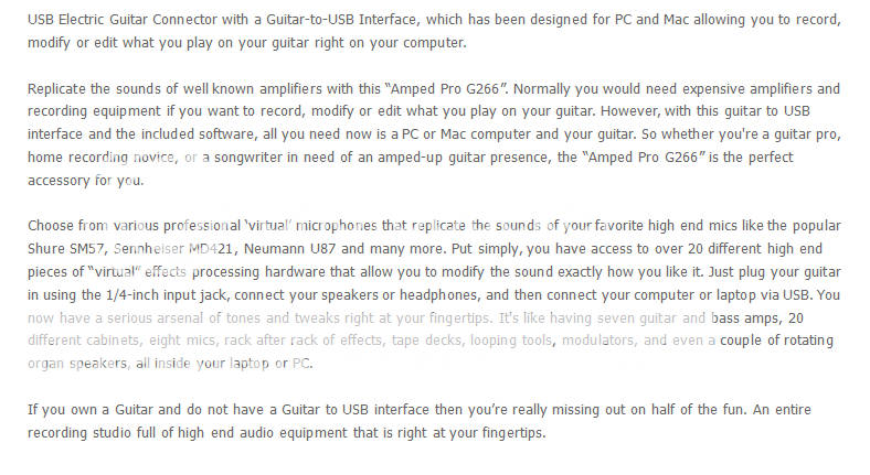 USB Electric Guitar Connector "Amped Pro G266" - Guitar-to-USB Interface, For PC + Mac