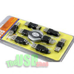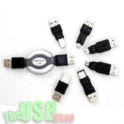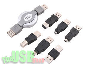 1x USB male to female retractable cable 1x USB male to male adapter 1x USB male to printer adapter 1x USB male to 6P 1394 firewire adapter 1x USB male to 4P 1394 firewire adapter 1xUSB male to Mini 4P adapter 1x USB male to Mini 5P adapter