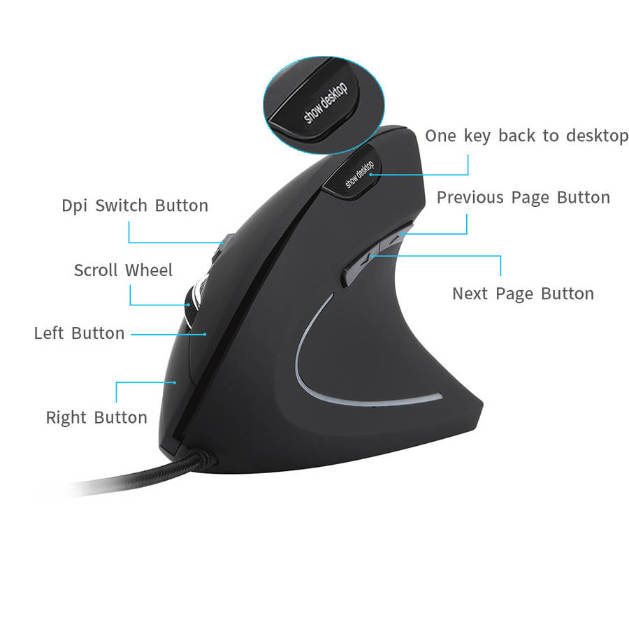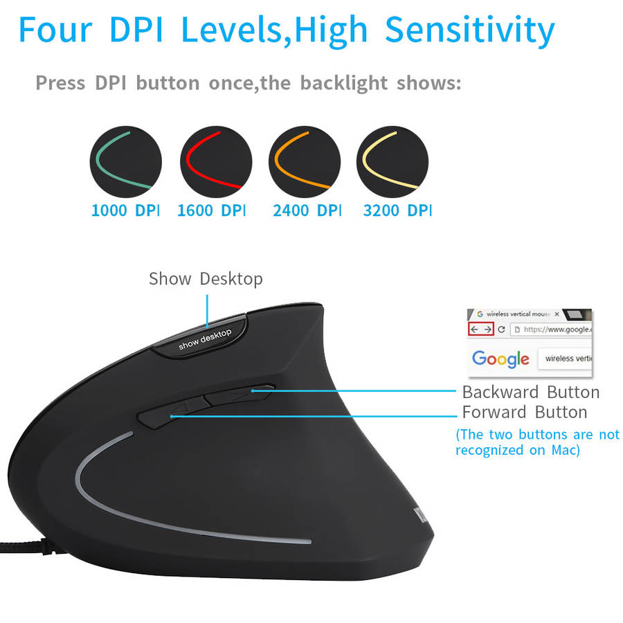 1. The adjustable DPI allows you to change the sensitivity of the mouse's pointer speed. 2. Ergonomic vertical design, efectively remitting and preventing carpal tunnel syndrome, just say goodbye to the "Mouse Hand" 3. "Show desktop" button, allows you to get back to your desktop just by an easy click on the mouse, convenient for office and game users.