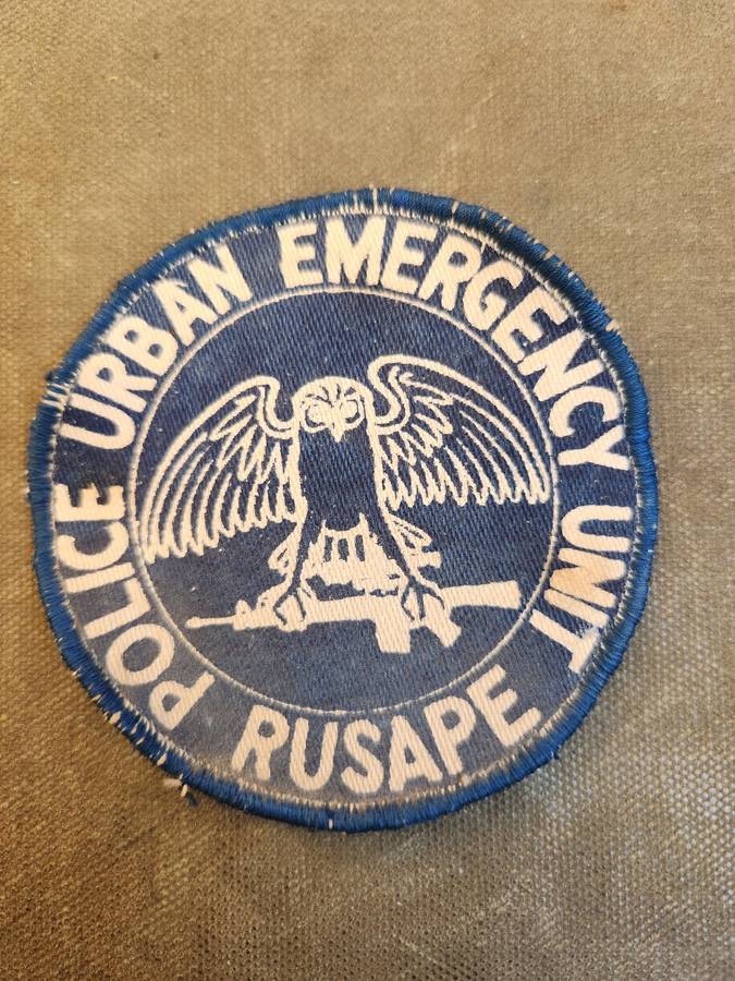 Here on auction we have a VERY scarce RARE and hard to find 100% original period Rhodesia BSAP blue cloth Police Urban Emergency Unit Rusape badge in good intact used condition.