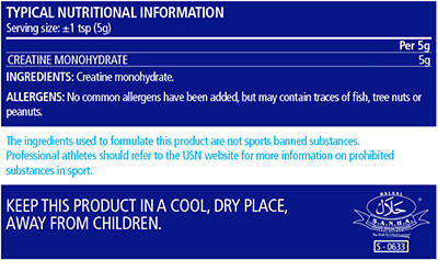 USN’s Micronized Creatine is suspended in its purest state for optimal absorption and bioavailability. Hydration is important when taking this product - remember to drink at least 10-12 glasses of water per day.