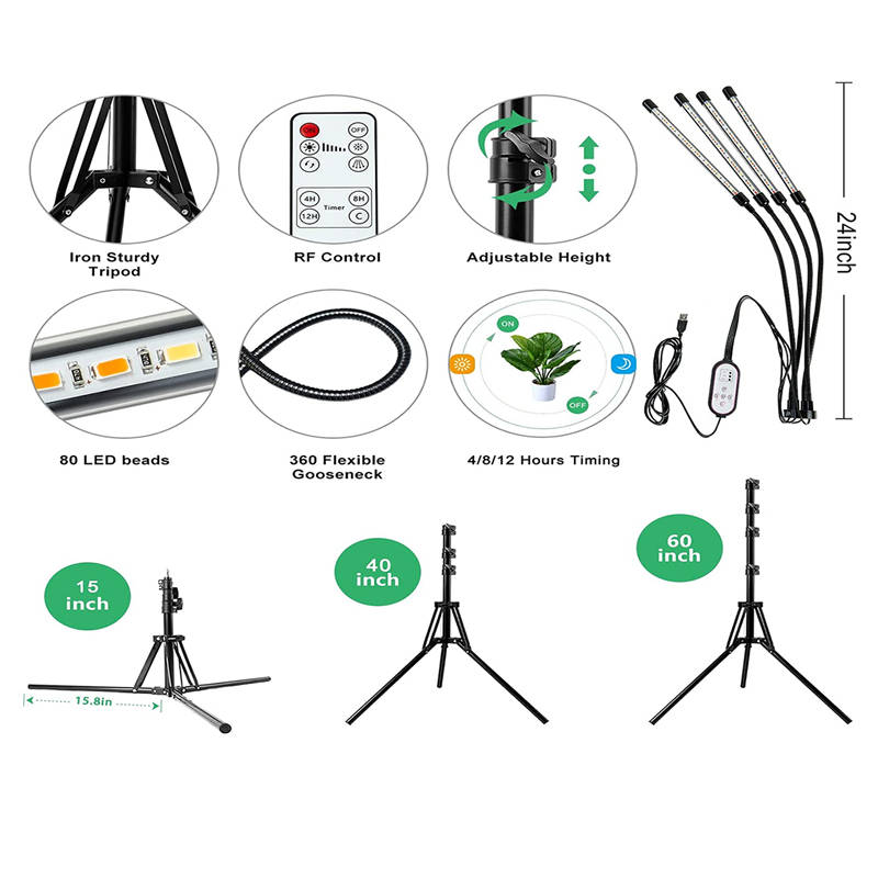 Newest 36W Four Heads LED Grow Light Full Spectrum with 80 PCs(Blue and Red) LED Beads, 5V 3A Output USB Port LED Grow Light with Timer for Indoor Plants