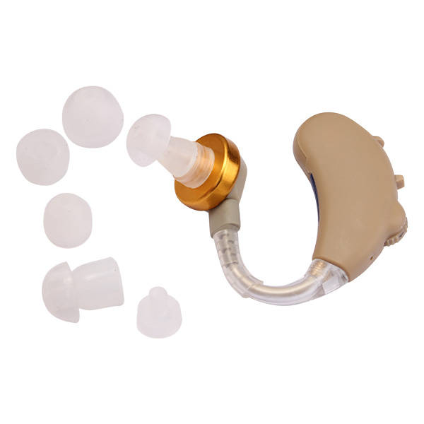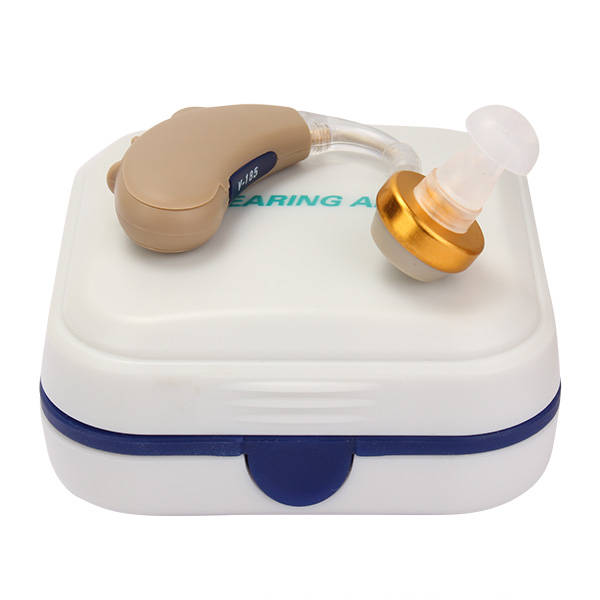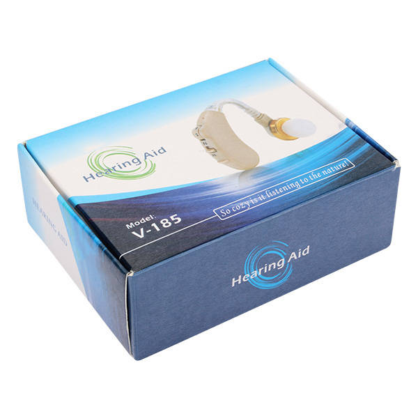 Description: Model: V-185 Type: BTE Color: As show in the pictures Battery: 2 AG13 battery Max Sound Output: 127dB ± 4dB Max Sound Gain: 48dB ± 5dB Total Harmonic Distortion: ≤4% Frequency Range: f<1000Hz≤3%, f>1000Hz≤2% Equiv Input Noise: ≤30 dB Working Voltage D. C. 1.5V Working Current: ≤3 mA Package Size: About 10*7.5*3.5cm Package Weight: 100g
