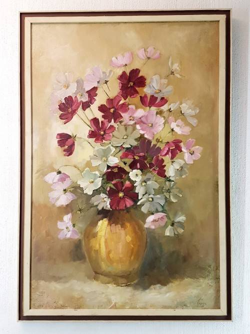 A stunning still life!! The paint is very thickly applied providing depth and the level of detail is outstanding!! The painting measures 90cm x 60cm and the frame measures 99cm x 68cm. Bid now!!